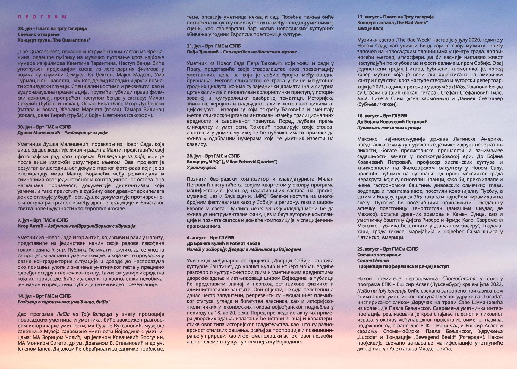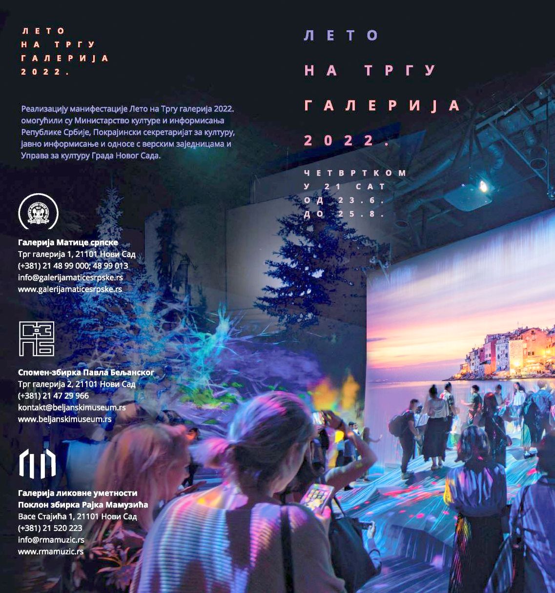 Podsećamo da se kultura i turizam prepliću i kroz manifestaciju Leto na Trgu galerija koja se u Novom Sadu, ovogodišnjoj evropskoj prestonici kulture, u organizaciji Galerije Matice srpske, Spomen-zbirke Pavla Beljanskog i Galerije likovne umetnosti poklon zbirke Rajka Mamuzića, odvija već deset godina. Manifestacija traje do 25.avgusta a ISTN program daje u dodatku.