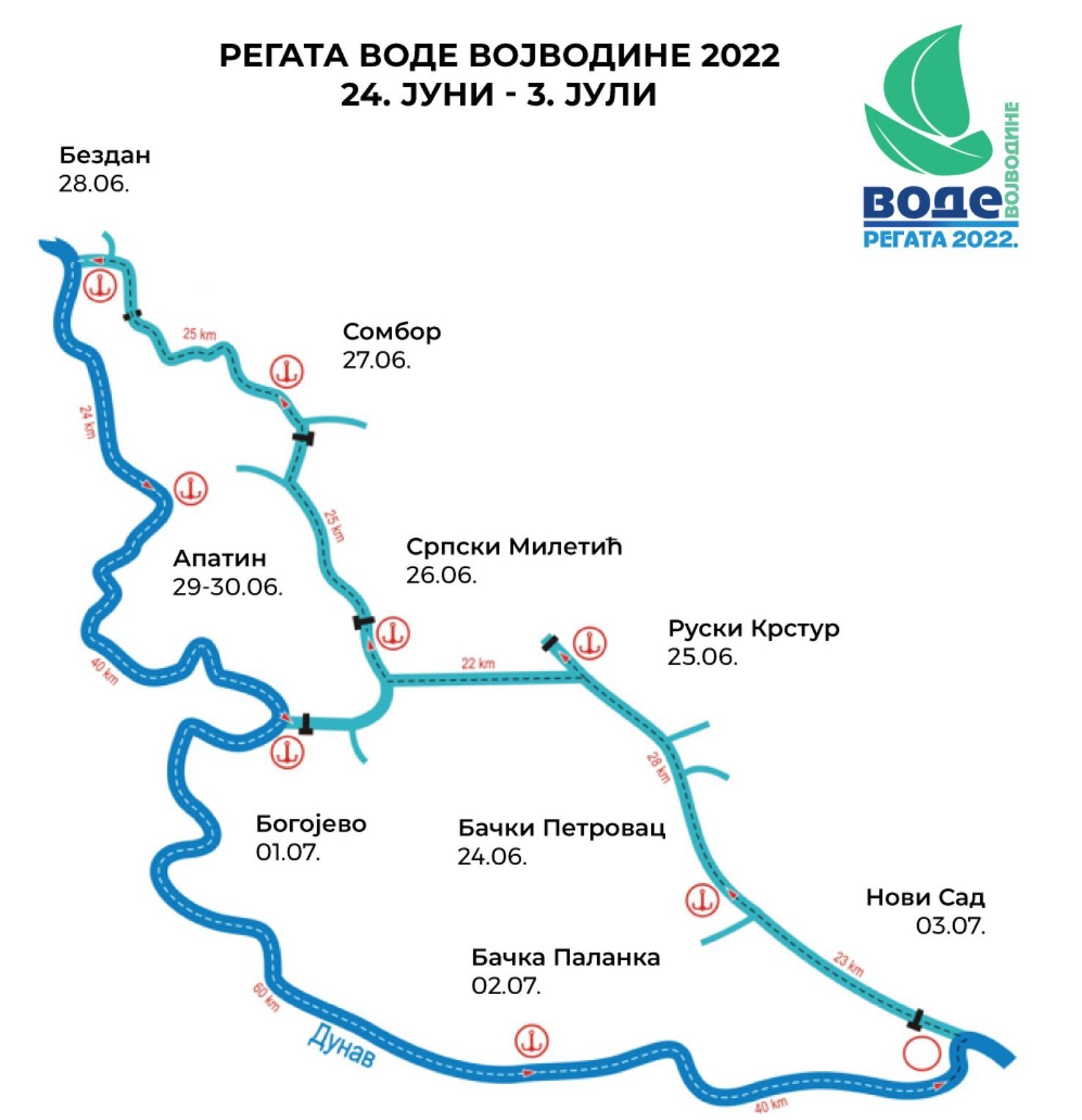 Pod motom “Čista voda, čista ljubav” na vojvođanskim kanalima i rekama po dvanaesti put je održana (24.06.-3.07.2022.) međunarodna regata „Vode Vojvodine“. Učesnici su za deset dana prešli maršrutu od 300 kilometara na relaciji Novi Sad – Bački Petrovac – Ruski Krstur – Srpski Miletić – Sombor – Bezdan – Apatin – Bogojevo – Bačka Palanka. Plovidbom, u kojoj je učestvovalo 81 plovilo sa 328 članova posada, obeležen je i Dan Dunava (29.jun) kada su regataši u Apatinu prisustvovali manifestaciji organizovanoj tim povodom.